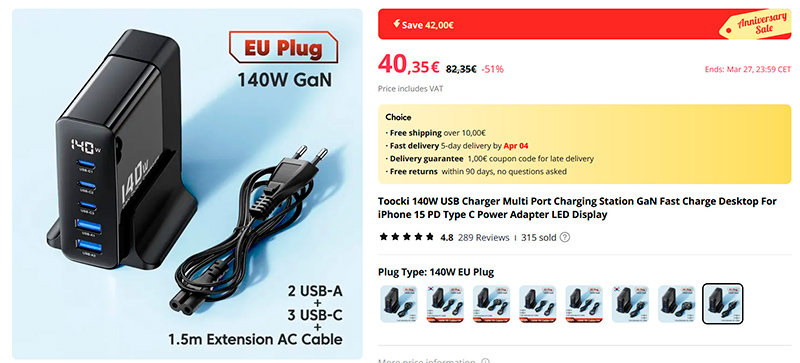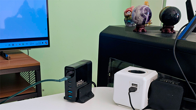 Мощный - аж на 140 Вт - GaN адаптер питания Toocki на 5 портов с кабелем на 1,5 метра для подключения к сети. На дисплее адаптера показывается текущая мощность зарядки - это очень удобно.