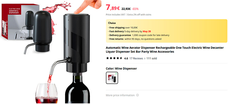 Последние года два я пользуюсь вот таким аэратором-диспенсером для красного вина. Из всего, что у меня было, этот - самый удобный. Заряжается от USB, хорошо насыщает вино кислородом, да и разливать вино по бокалам с его помощью очень удобно.