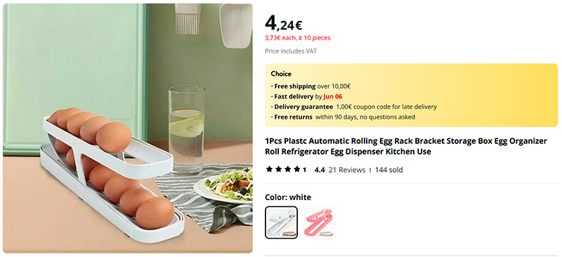 Завирусившаяся в Сети штука - автоподатчик для куриных яиц. Покупаете упаковку из 12 яиц, кладете в такую подставку, достаете одно яйцо, остальные яйца сдвигаются на одну позицию вниз. Прикольно. Там есть еще четырехэтажная аналогичная подставка, но она и высокая, и не слишком удобная, как мне кажется.