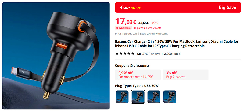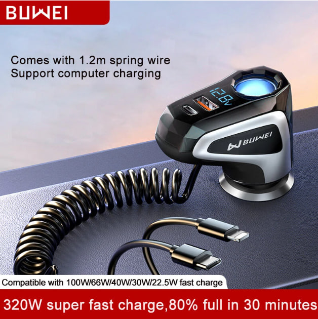 Смотрите, какая классная штука - мощный (60 Вт) автомобильный адаптер для зарядки смартфона со встроенным разматывающимся шнуром до 70 см. Больше не надо держать спутанные кабели в машине. Подключил, зарядил, отключил - кабель спрятался в адаптер. Есть версии под Type-C и Lightning, есть дополнительный зарядный порт USB-A или Type-C. Класс, заказываю!