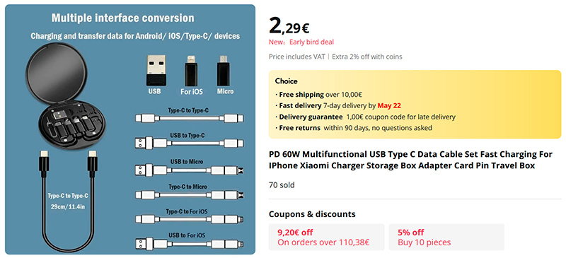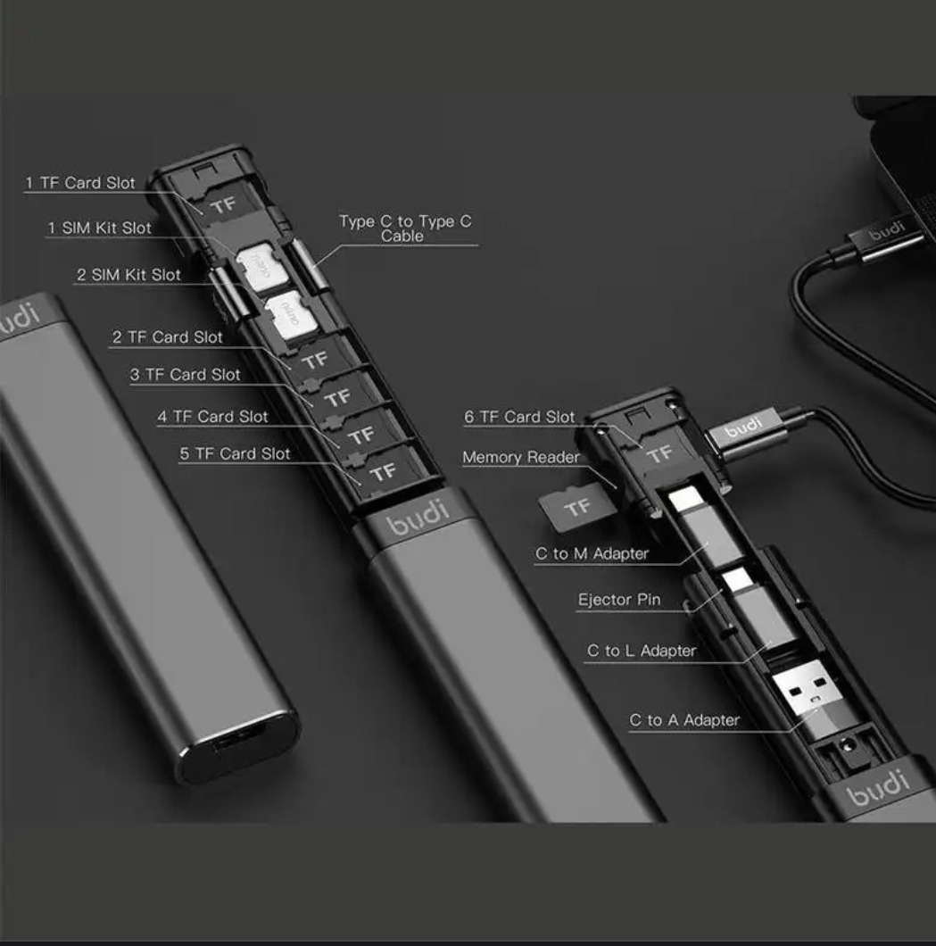 Компактный набор самых разнообразных переходников - чтобы не таскать с собой кучу проводов. Кабель Type-C - Type-C, к которому идут переходники под USB-A, microUSB и Lightning. Также в комплект входит инструмент для вытаскивания симкарты из смартфона. Кинуть такой в сумку - нужный переходник всегда будет под рукой.