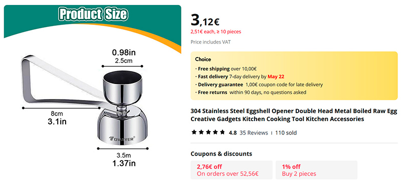 Продвинутый айершаллензолльбрухштелленферурзахер (разбивалка для вареных яиц, чтобы срезать кончик яйца), который, во-первых, может делать два размера крышечки, а, во-вторых, должен прослужить несколько дольше, чем мой, купленный на Амазоне, который сломался через два месяца после покупки. Здесь же другая конструкция.