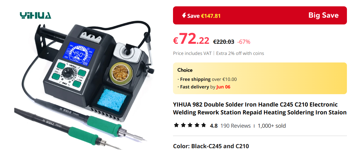 Почти JBC, но по китайской цене. Можно подсоединить разные размеры паяльников. Элементы тоже можно докупать на Али по смешной цене. Довольно мягкий провод, точная регулировка температуры. Не знаю, сколько проработает, но пока доволен.