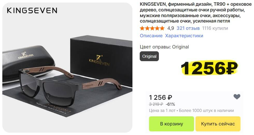 Отличные отзывы. Куча продаж. Очки имеют дужки, стилизованные под дерево, поставляются в жёстком футляре и подарочной коробке. На выбор линзы разных цветов и с разной степенью затемнения.
