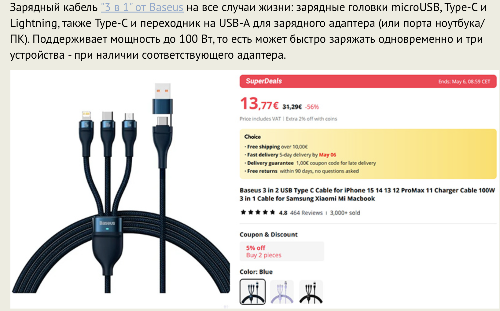 На ноут свои 65 Вт зарядки он мне честно выдал - посмотрел в системном отчете. Качество оплетки хорошее. В общем, для поездок - очень советую, я себе три штуки заказал и просто по чемоданам/в машину распихал, чтобы под рукой был.