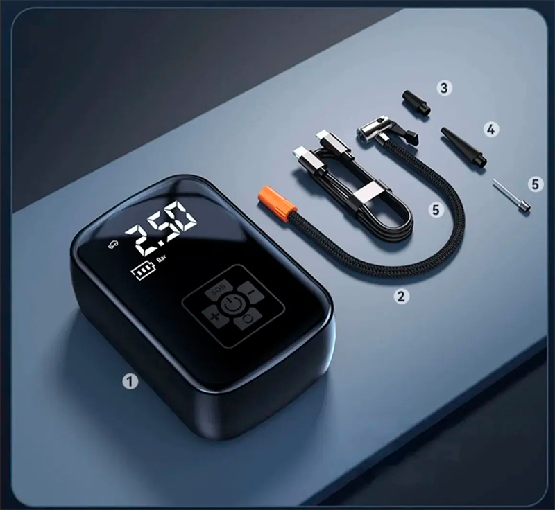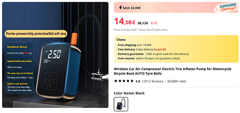 Очень популярный на Aliexpress беспроводной электрический компрессор для накачки шин автомобилей, мотоциклов, велосипедов, мячей, надувных матрасов и так далее. Производитель обещает, что этот насос может накачать шину автомобиля с нуля за 3,5 минуты. Мощный аккумулятор, предустановленные режимы, дисплей, индикатор уровня заряда аккумулятора. В комплект входят дополнительные насадки. Более 50 тысяч продано, 13 тысяч отзывов со средней оценкой 4,8.