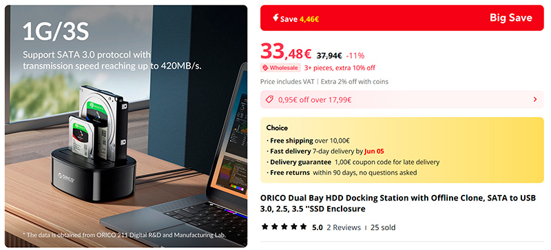 Валяются в шкафу старые ненужные жесткие диски на терабайт (два, три)? Ну так используйте их для бэкапов или в качестве накопителей для медиаплеера! Для этого достаточно приобрести вот такую недорогую док-станцию на два диска, и вы получаете удобный внешний ёмкий накопитель. Через USB 3.0 скорости вполне пристойные - порядка 60 мегабайт/сек (420MB/s), - и этого вполне хватит как для бэкапов, так и для воспроизводства фильмов с разрешением 4K. Также диски в док-станции, разумеется, можно менять - для дубля бэкапов. А еще диски в этой док-станции умеют "засыпать" при неактивности и при этом практически не потребляют электричество. Также есть кнопка копирования содержимого одного диска на другой без использования компьютера - тоже может пригодиться.
