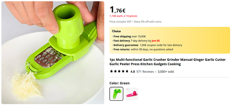 Простенькая терка для чеснока. Я чеснока использую много, а резать его не люблю - заказал, посмотрим ее в деле. Можно, конечно, использовать пресс для чеснока, но его потом мыть замучаешься. С этой штукой должно быть все проще - проверю.