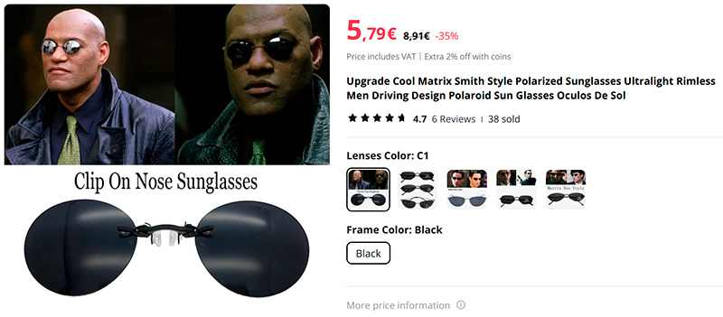 Прикольная штука - поляризационные темные очки в стиле "Матрицы". Причем там три разных модели: пенсне Морфеуса, очки Нео и очки агента Смита.