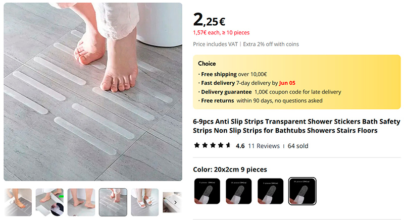 Полезная штука - противоскользящие полоски для душа. Наклеиваете несколько штук - и нет риска поскользнуться на влажном полу. У меня коврик с резиновым основанием, конечно, есть, но его периодически надо стирать, потом он где-то полтора дня сушится - куплю такие штуки, наклею, пригодится, а то я несколько раз уже "уезжал" на влажном полу без коврика.