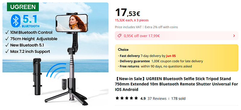 Новый удобный телескопический складной трипод, он же селфи-палка. Выдвигается на высоту до 75 сантиметров, bluetooth 5.1, работает со смартфонами до 7,2", держатель смартфона может поворачиваться на 360 градусов, дистанционное управление с пульта.