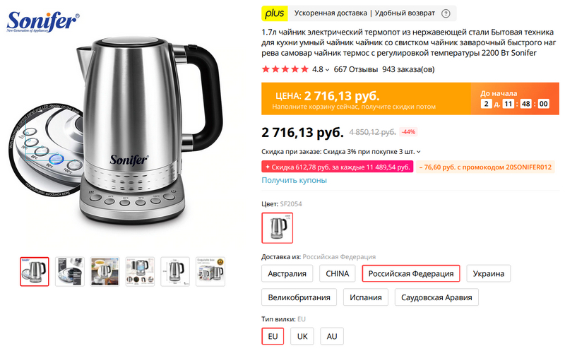 Недорогой металлический электрический чайник с поддержкой нагревания до различных температур и с сохранением заданной температуры до двух часов. Есть доставка со склада в РФ.