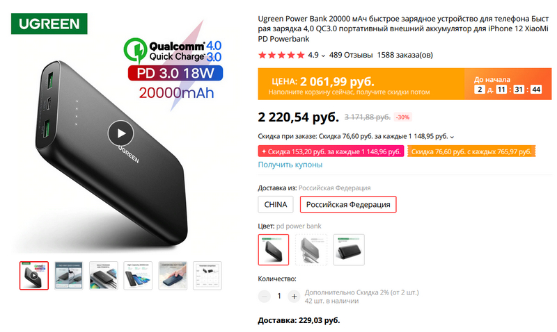 Крутой и недорогой внешний аккумулятор от Ugreen на 20000 мА·ч с поддержкой QC 3.0 на 18 ватт и Power Delivery 3.0 18 ватт, есть доставка с российского склада.