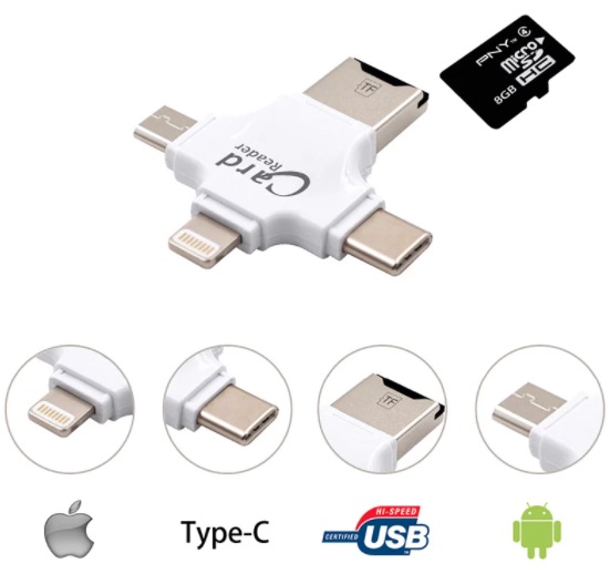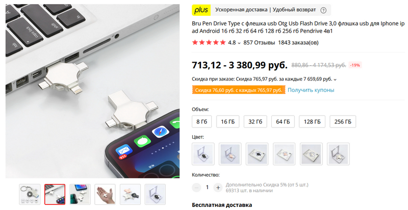 Полностью универсальный USB-накопитель желаемой емкости под айфоны и смартфоны на Android с microUSB и Type-C. Полезная штука. И ее можно носить в виде брелка на ключах - там есть соответствующее ушко.
