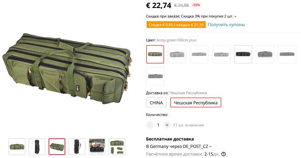 рубрика "рыбак рыбака": заказал себе вторую сумку для удочек и рыбацкого хозяйства, доставка из Чехии в Германию (только размер 100 см) очень быстрая и цена очень адекватная, дешевле даже чем из Китая! это будет вторая, основная для удочек уже есть, подлиннее, эта пойдет на замену старого боевого рюкзака, в который перестал помещаться и что-то вечно приходится таскать рядом с удочками - подсак, родпод и всякие подставки с уключинами, коробки с поплавками, инструменты и т.п. Три секции и куча карманов, размер хапужный 100х25х28 ("плюс" называется у продавца), лямки рюкзачные, кстати, у нее тоже есть! НХНЧ! ЗЫ: эти же сумки с успехом используют страйкболисты и фотографы.
