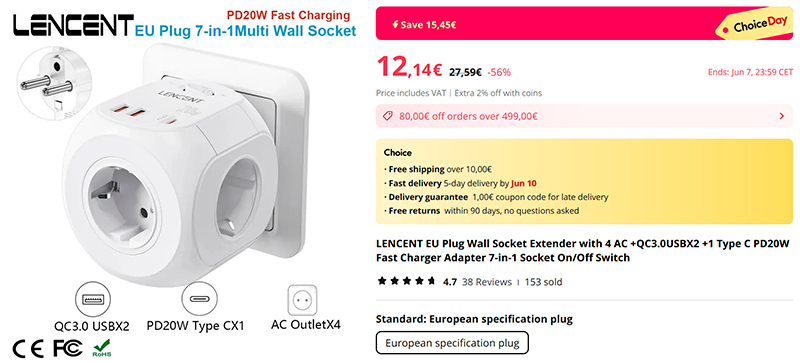 Четыре европейских розетки, два порта USB-A с поддержкой QC3.0, порт Type-C с PD 20 Вт, да еще и с выключателем. Взял сразу три штуки - очень удобно.