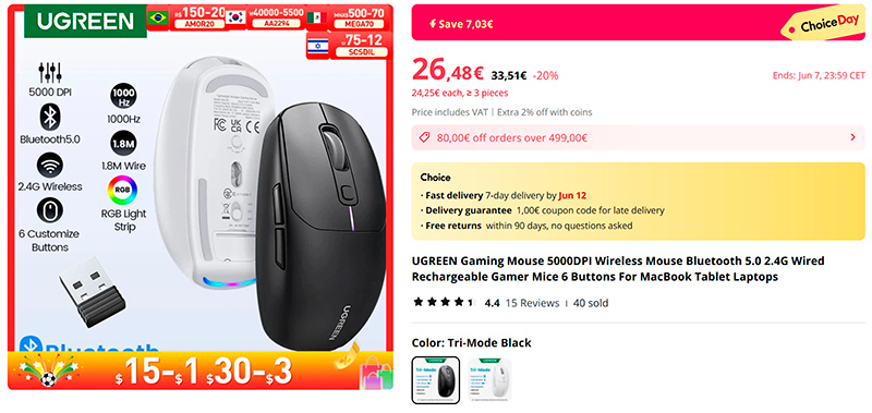 Компания Ugreen выпустила новую недорогую игровую мышку с разрешением 5000DPI с аж тремя видами подключения: по Bluetooth 5.0, через USB-адаптер, также она может работать и при подключении по кабелю. 6 кнопок, заряжается через порт Type-C, есть RGB-подсветка, чувствительность регулируется, два варианта цветов.