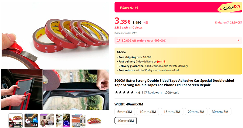 Мне нужна была очень надежная двухсторонняя клейкая лента, которая к тому же не боится влаги. Почитал обзоры - порекомендовали вот эту. Пишут, что реально все крепит очень надежно, не боится влаги, причем даже дождь на нее не влияет. Есть разные варианты: все имеют длину 3 метра, ширина от 6 до 30 мм. Заказал самый узкий и самый широкий варианты.