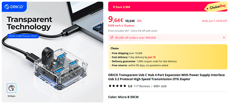 Ну а если нужно что-то простенькое, на 4 порта, недорогое и стильное, то вот дешевый четырехпортовый прозрачный хаб от Orico. Выглядит необычно, есть разные варианты комплектных проводов.