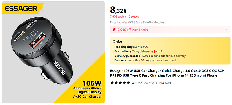 Мощный зарядный адаптер компании Essager в прикуриватель автомобиля аж на 105 Вт с тремя портами и дисплеем, показывающим мощность заряда. Поддерживаются PD3.0 и QC4.0. Отзывы хорошие.