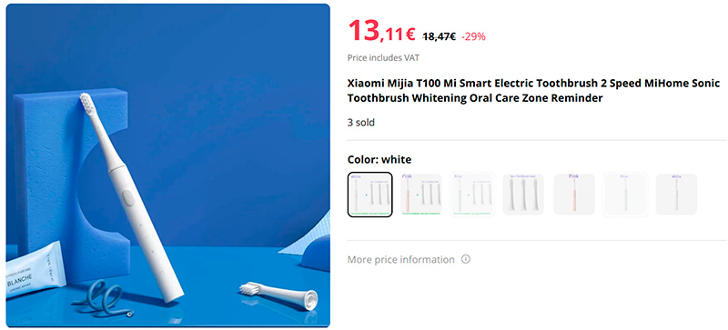 У Xiaomi Mijia есть более дешевый и не сказать что плохой вариант - Xiaomi Mijia T100. Тоже вибрационная зубная щетка, два режима очистки, каждые 30 секунд вибрирует для перехода на другую зону, одного заряда хватает примерно на месяц использования. Заряжается через USB. Три варианта цветов: белая, бледно-голубая, бледно-розовая.