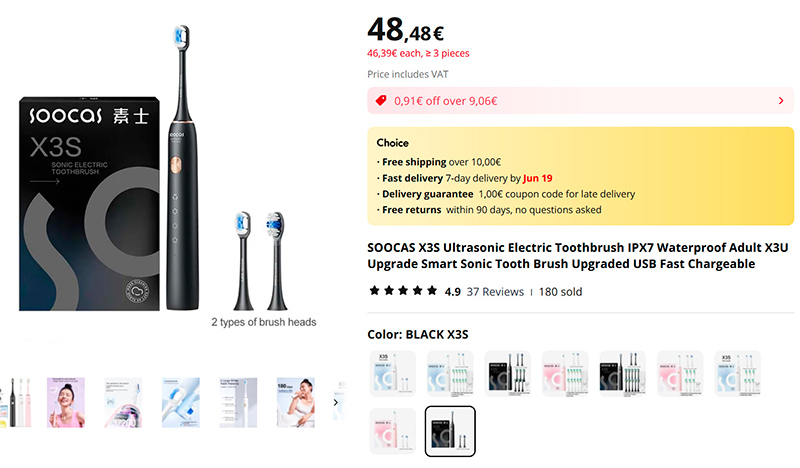 Из электрических зубных щеток я сам предпочитаю Soocas. Я их много разных перепробовал, но вот именно Soocas мне нравится больше всего, причем нравится значительно больше дорогих моделей известных производителей, типа Philips (мне из Philips пару раз присылали их топовые модели). Сначала у меня была Soocas X1, теперь я уже пятый год пользуюсь вот такой Soocas X3 и не собираюсь ее менять ни на какую другую модель. И сыну купил ее же.