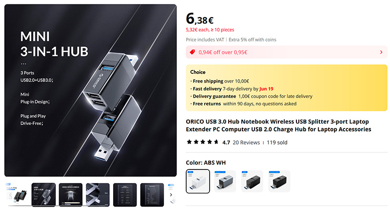 Сверхкомпактный USB-концентратор Orico для ноутбука на три порта: USB 3.0 и 2x USB 2.0. Классная штука, мы с женой похожие используем, но они на два порта.