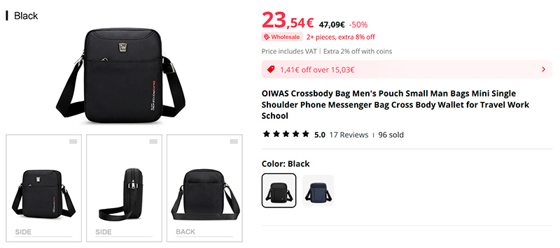 Недорогая наплечная сумка от OIWAS. Я именно такого типа сумку и использую. Она достаточно широкая, чтобы в нее смартфон можно было положить горизонтально, а не вертикально. Два варианта цветов.