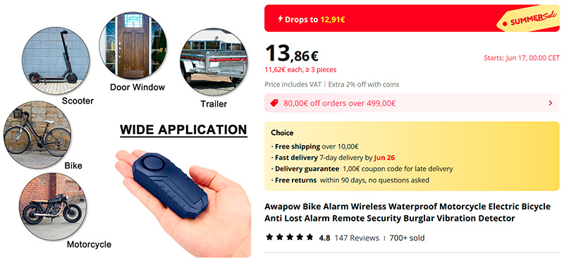 Любопытная какая штука - велосипедная сигнализация. Влагозащищенный блочок легко монтируется (две липучки и два пластиковых хомутика), в рабочий режим ставится с пульта. Устройство различает до 7 видов воздействий: на одни реагирует короткими сигналами, а на попытку перемещения устройства начинает завывать с громкостью 113 дБ. Ну и понятно, что его также можно использовать с самокатами, мотоциклами и, например, с чемоданом в поездке.