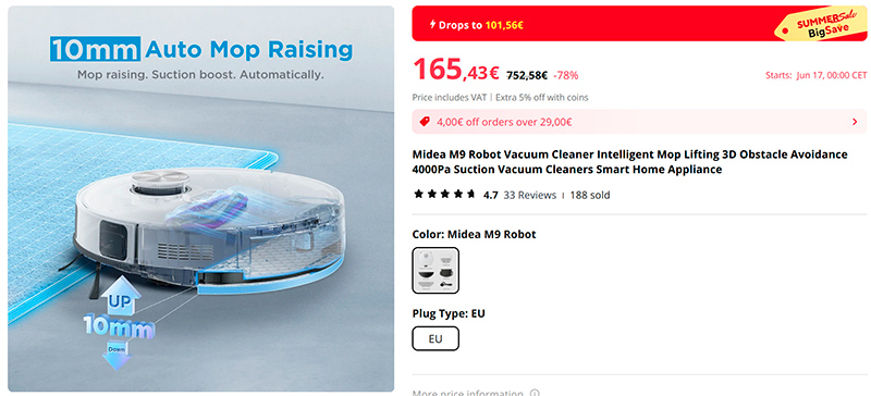 В самом начале продаж эта модель (ей где-то год) продавалась за €220. Но сейчас цена на нее уже €165, и это выглядит более чем интересно, потому что робот - очень и очень продвинутый, и он имеет функции, которые обычно встречаются у моделей в два раза дороже. А именно: лидар, мощность всасывания 4000 Па, влажная уборка, функция подъема насадки для влажной уборки на коврах, хорошая проходимость, 3D-система определения предметов, сохранение карт уборки, работа через приложение, виртуальные стены, регулировка подачи воды, работа по графику, автоматическое увеличение мощности на ковровых покрытиях, поддержка русского языка.
