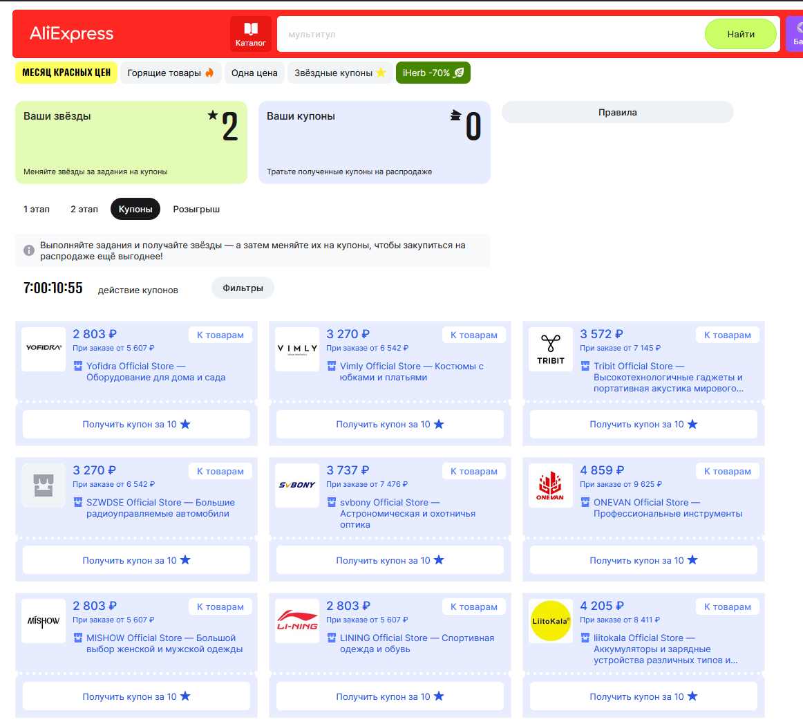 4. На распродаже Месяц красных цен Алиэкспресс запустил акцию Звездные купоны - за выполнение заданий получаете звезды, которые меняете на купоны (добавил скрины для понимания). Вот полные правила акции.