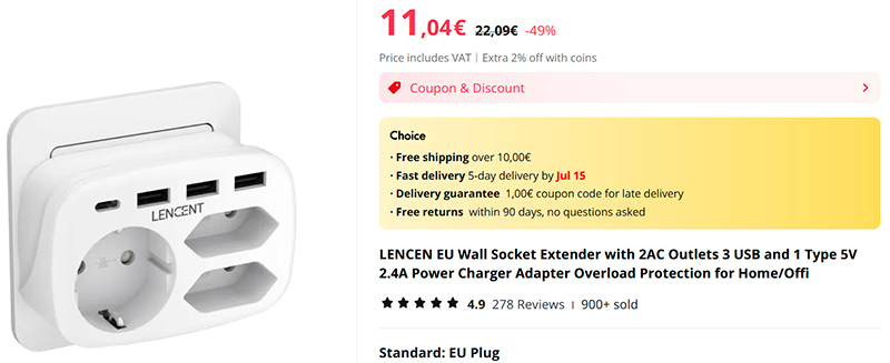 Компактный тройник с тремя розетками, тремя портами USB-A на 12 Вт  и портом Type-C на 15 Вт. Там же есть вариант с двумя евророзетками.