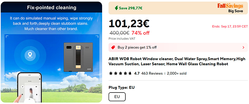 Робот нового типа для мойки окон - ABIR WD8 (ссылка для РФ). Мощное разбрызгивание, качественная мойка. Хорошие отзывы - средняя оценка 4,7 у 463 отзывов. Под скриншотом - русскоязычный обзор его работы. Я заказал себе, потестирую, мне очень актуально. У меня был робот старого типа - не особо нравилось, как он работал, хотя использовал несколько раз.
