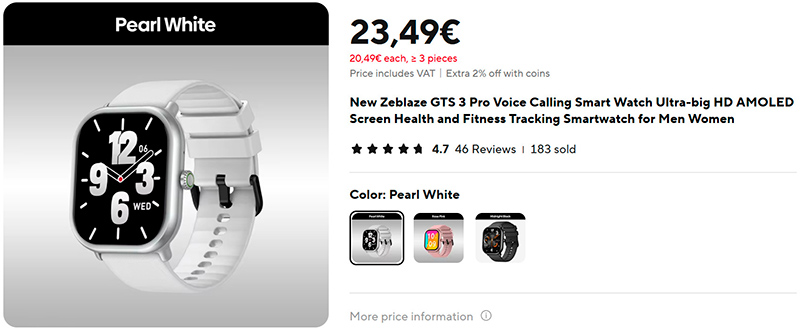 У этого производителя вышла новая модель - Zeblaze GTS 3 Pro (ссылка для РФ). Небольшие, прямоугольные, дисплей AMOLED 415x505, есть AOD, весят 21 г, 100+ спортивных режимов. Три варианта цветов.