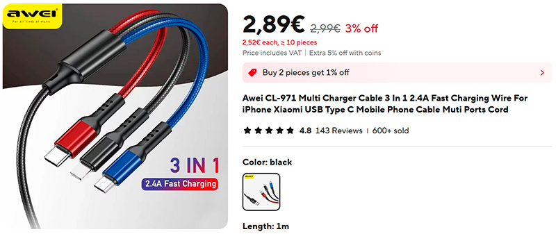 Всегда полезный в хозяйстве зарядный кабель "3 в 1" (ссылка для РФ): microUSB, Type-C, Lightning. Самый удобный вариант - у каждой головки свой специфический цвет, не перепутаете. Я только такие теперь и использую.
