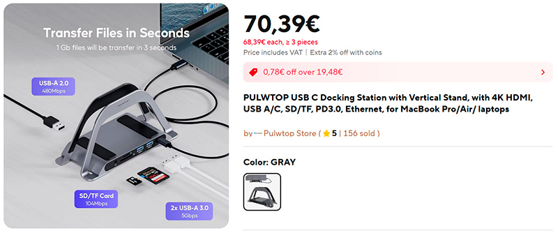 Док-станция для ноутбука "10 в 1" (ссылка для РФ), она же - вертикальная подставка. Поддерживает до двух внешних мониторов и сквозное питание для ноутбука (чтобы питать и док-станцию, и ноутбук от одного адаптера) до 100 Вт.
