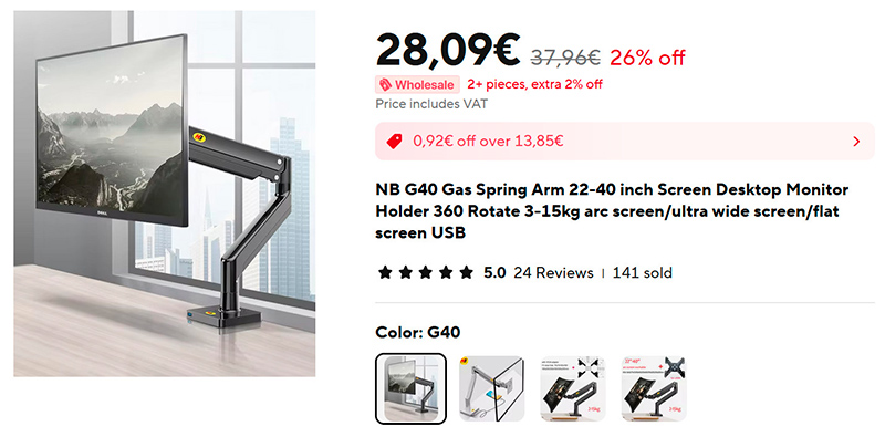 Искал для нового монитора сына подставку с различными степенями свободы, которая крепилась бы к столу на надежной струбцине, чтобы монитор с легкостью можно было бы приближать, отдалять, поворачивать и так далее. Понравился вот этот вариант (ссылка для РФ) - он вроде бы отвечает всем поставленным задачам. Сама подставка рассчитана на стандарты VESA 75X75/100X100 мм, однако там есть два вида комплектаций переходниками, с помощью которых можно приспособить подставку под все размеры VESA.