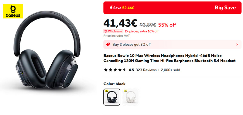 Baseus Bowie 10 Max (ссылка для РФ) - недорогие складные полноформаты с активным гибридным шумодавом, поддержкой кодеков AAC и LDAC, низкой задержкой и поддержкой Bluetooth 5.4. До 120 часов воспроизведения. Два варианта цветов.