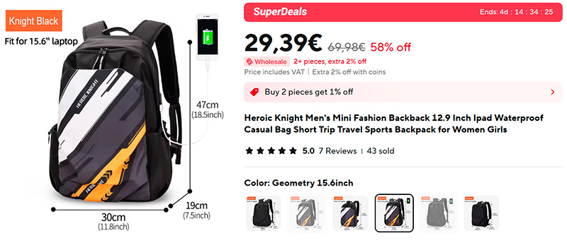 Недорогой рюкзак (ссылка для РФ) с оригинальной расцветкой (есть и чисто черный вариант) с отделением для большого планшета (12,9") или ноутбука (15,6") из водонепроницаемой ткани. Лямки с сетчатыми вставками, несколько отделений, порт для зарядки гаджетов.