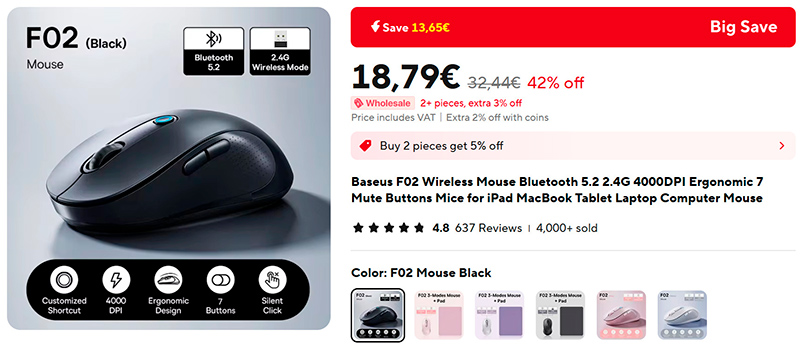 Недорогая беспроводная эргономичная мышка Baseus F02 (ссылка для РФ)  с поддержкой подключения как по Bluetooth 5.2 так и через адаптер, разрешение до 4000 DPI (настраивается), 7 бесшумных кнопок (одна кнопка настраивается), может поддерживать одновременно два устройства (с разными видами подключения), сигнализирует о разряде батарейки. Средняя оценка 4,8 из 637 отзывов.