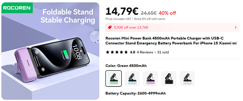 Очень компактный, но достаточной емкий внешний аккумулятор Rocoren Mini Power Bank 4500mAh (ссылка для РФ) для быстрой подзарядки (мощностью до 12 Вт) смартфона/планшета, не требующий кабеля для подключения. Также он снабжен подставкой, так что смартфон во время зарядки можно устанавливать для, например, просмотра видео или серфинга в Интернете. Несколько вариантов цветов.