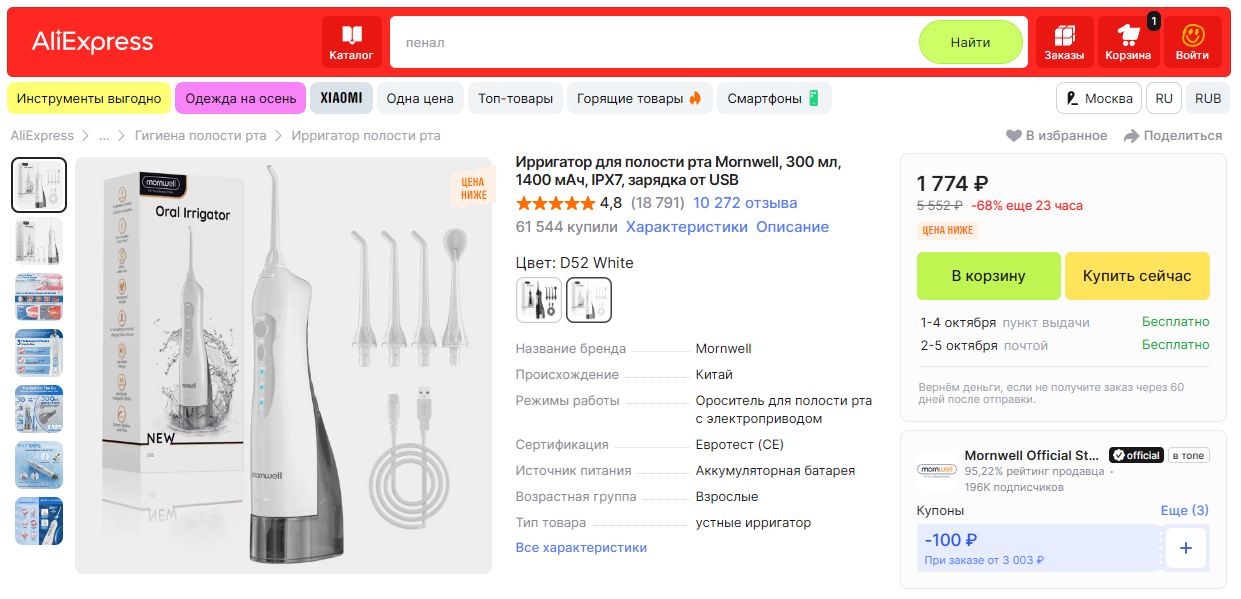 Недорогой ирригатор Mornwell (300 мл, 1400 мАч, IPX7, зарядка от USB) + купон на скидку