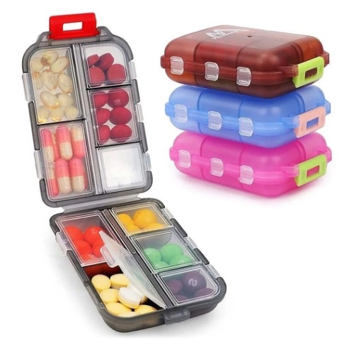 Дорожная таблетница на 10 отделений. Каждое отделение закрывается индивидуальной крышечкой. Размер корпуса - с кредитную карту (6х9 см), толщина в сложенном виде 3 см. Естественно, подойдёт не только для таблеток, но и для всякой другой мелочёвки: винтиков, пуговиц и т. п.