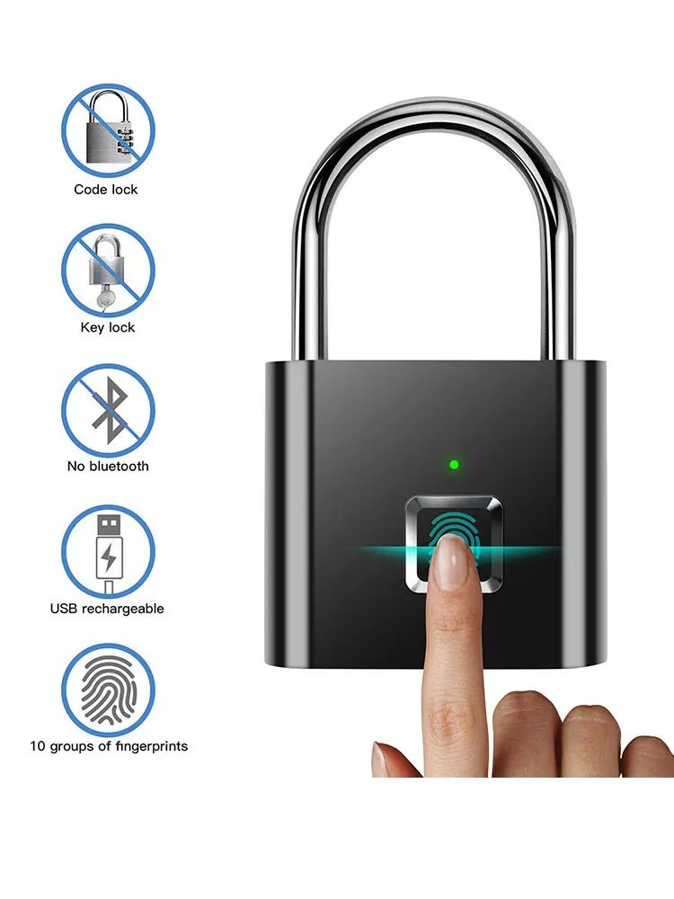 Работает от отпечатка пальца, в память можно загрузить до 10 отпечатков. Время срабатывания 0,5 сек. Аккумулятор рассчитан на 1000 срабатываний или на полгода работы без подзарядки. Заряжается от микроusb разъема. При полной разрядке замок остается закрытым.
