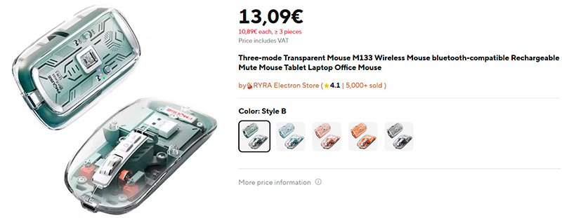 Забавная штука - мышка с прозрачной верхней крышкой (ссылка для РФ). Верхняя крышка - съемная. У мышки вполне приличные харастеристики: подключается и через адаптер, и через Bluetooth, имеет разрешение 1600 DPI, заряжается через USB-порт.