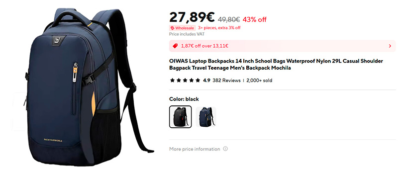 Качественный и недорогой рюкзак от производителя QIWAS (ссылка для РФ). Влагонепроницаемый, 29 литров, влезает ноутбук до 14". Средняя оценка 4,9 из 382 отзывов.
