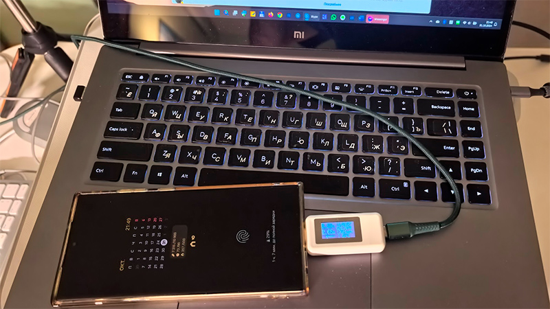 Ну и вот видно на фото: ноутбук нормально питается и при этом смартфон заряжается с мощностью в 23 Вт. То что нужно!