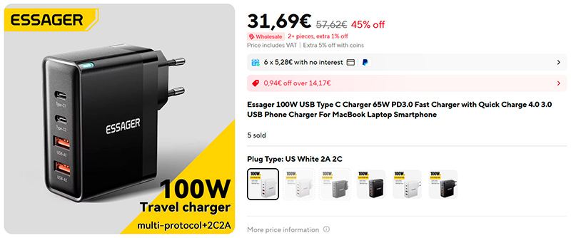 Заказал вот такой GaN-адаптер (ссылка для РФ), который на порту C1 держит 65 Вт, а на втором C2 одновременно выдает 30 Вт.