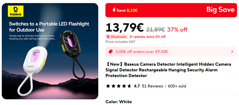 Компания Baseus выпустила новый детектор скрытых камер (ссылка для РФ). Штука, по нынешним временам, актуальная, вопрос только в том, насколько она эффективно будет работать. Заказал, проверю.