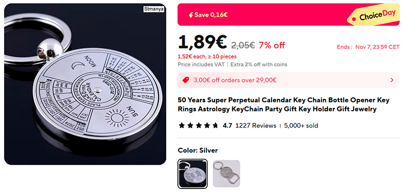 С моей страстью к различным брелокам - брелок с "вечным" календарем (ссылка для РФ), которого хватит на ближайшие 50 лет. Вот, например, захотите вы узнать, на какой день недели придется ваш ДР через 5 лет - пожалуйста! А через 50 лет можно и новый брелок купить, правильно? Кстати, там по ссылке есть еще один вариант этого брелока - с открывалкой для бутылок. Открывалка рассчитана лет на 70, не меньше.
